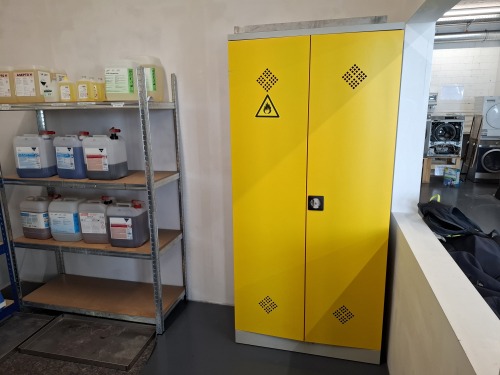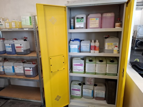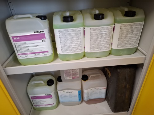 - Zahlreiche Bidons mit (Spezial-)Reinigungsmitteln