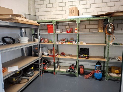 Gebraucht. Zustand und Umfang gemäss Abbildungen. Die Geräte wurden nicht auf deren Funktionstüchtigkeit überprüft. Werkbank und Regale müssen vom Erwerber selber abgebaut werden.