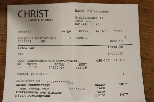 1 Armbanduhr Longines Hydro Conquest Automatik, intakt, gekauft im Jahr 2022 gemäss beigefügter Quittung.