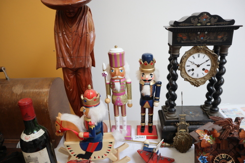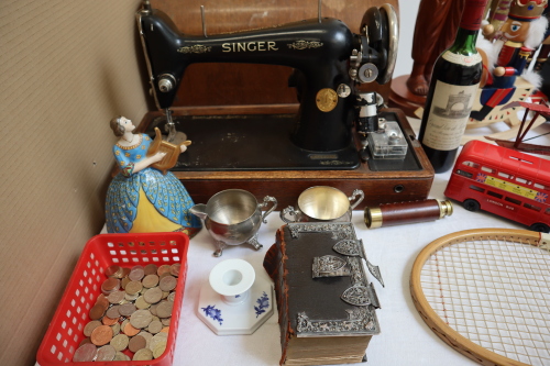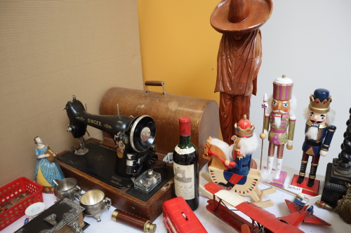 1 historische Nähmaschine Singer, Nussknacker, Tennisschläger, Tischuhr, 1 Weinflasche, Bücher