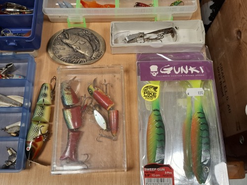 - viel Zubehör: Garn, Blei, Schwimmer, Kunstköder, Blei, Schwimmer, Löffel etc
