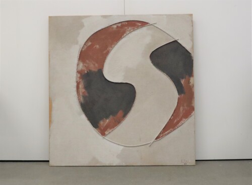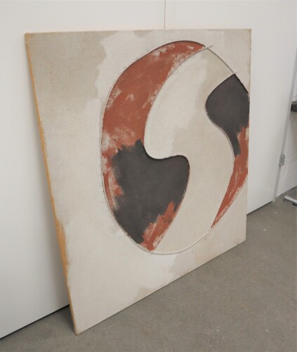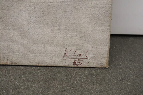 1 Bild Rohr und Öl auf Jute sign. Lenz Klotz 9.5.1985 "Figur S"